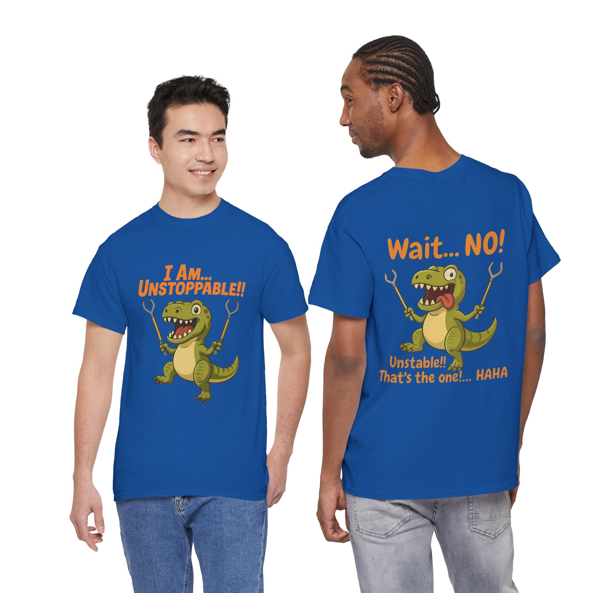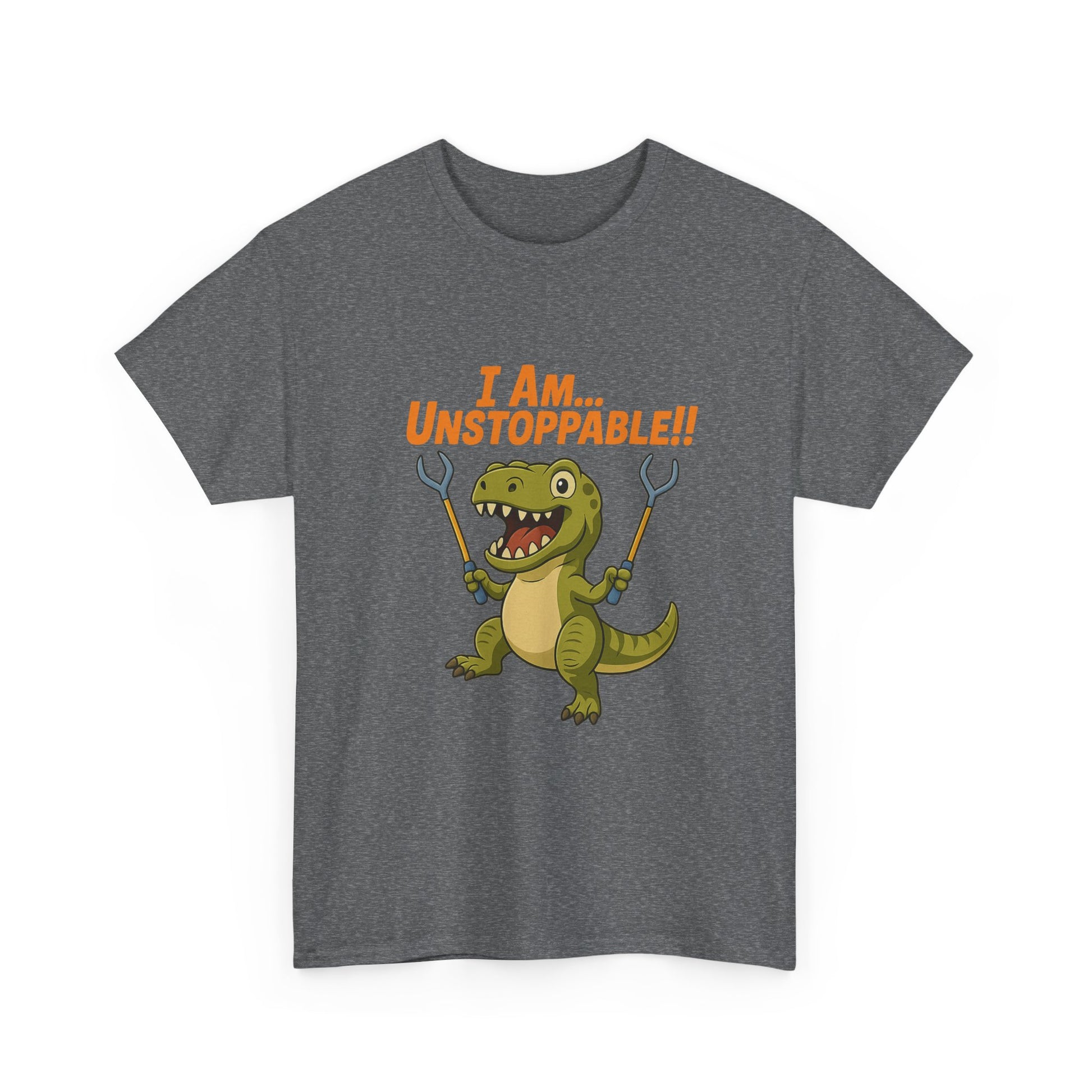 Front: Features a fierce (and cleverly equipped) T-Rex proudly wielding grabber arms, paired with the confident, defiant caption: "I Am Unstoppable!"